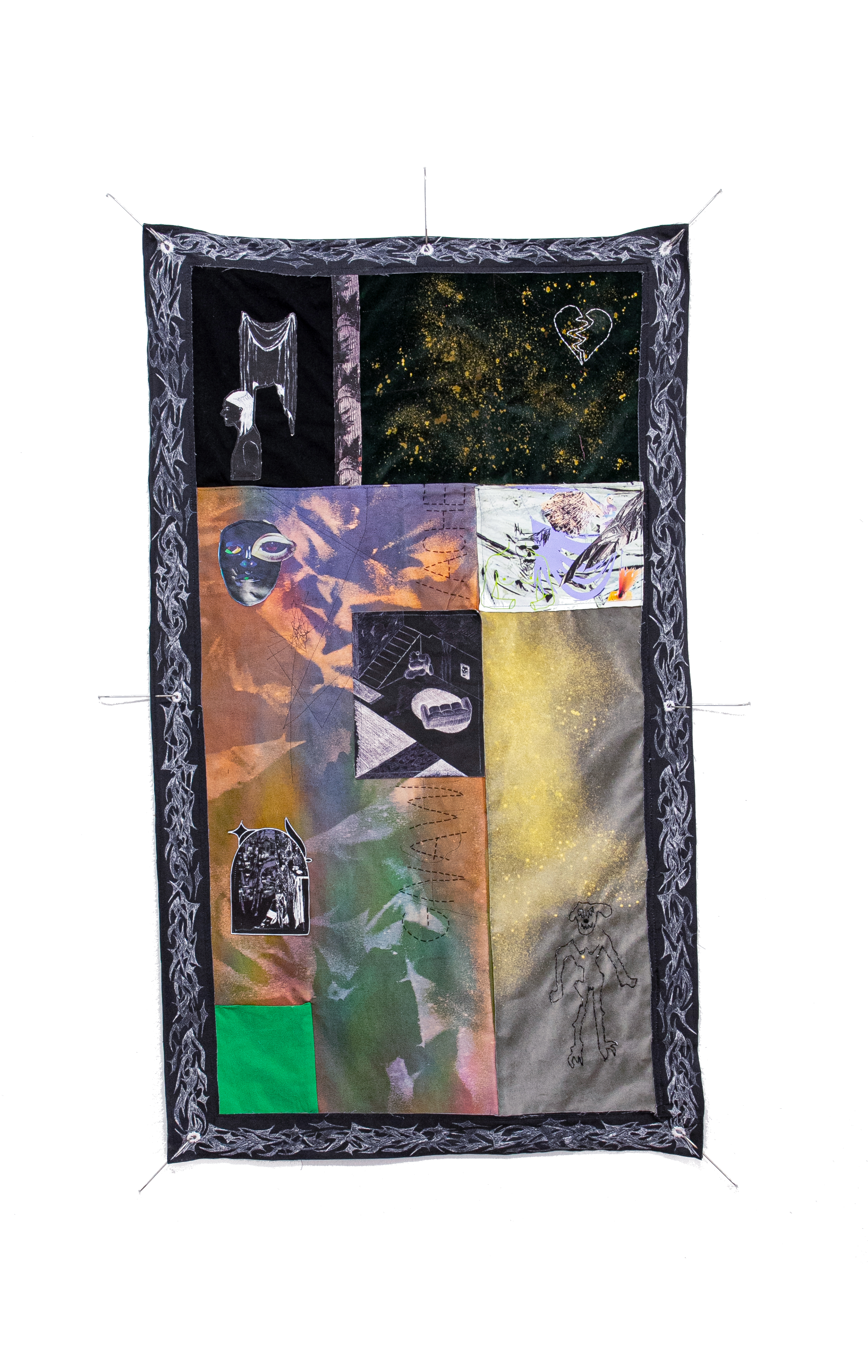 gnaw/ache, 2024, inkjet print on canvas, cotton, velvet, mixed media, 58 x 33 inches