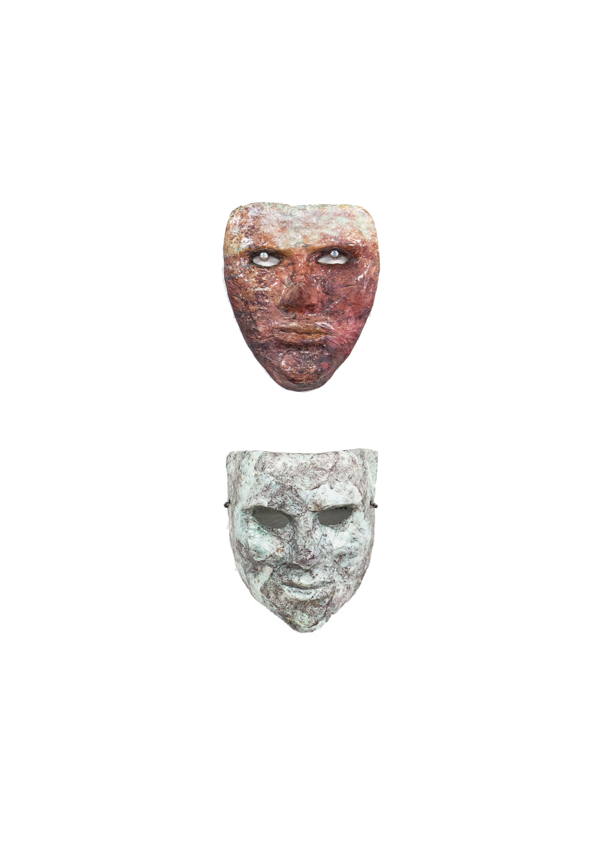 mask I, 2024, clay, paper, acrylic, iridescent powder, gloss decoupage, 7.5 x 6.25 x 3 inches