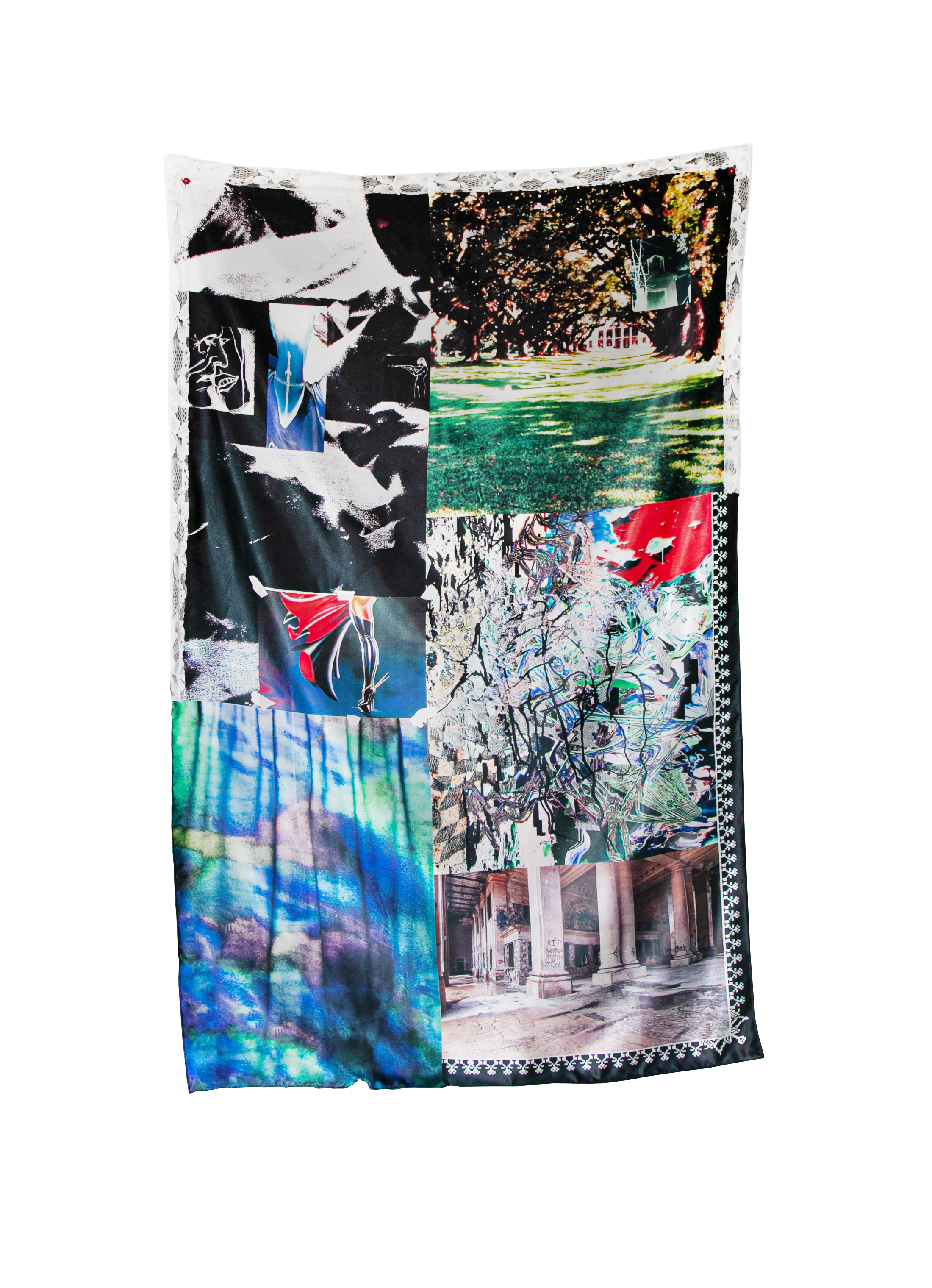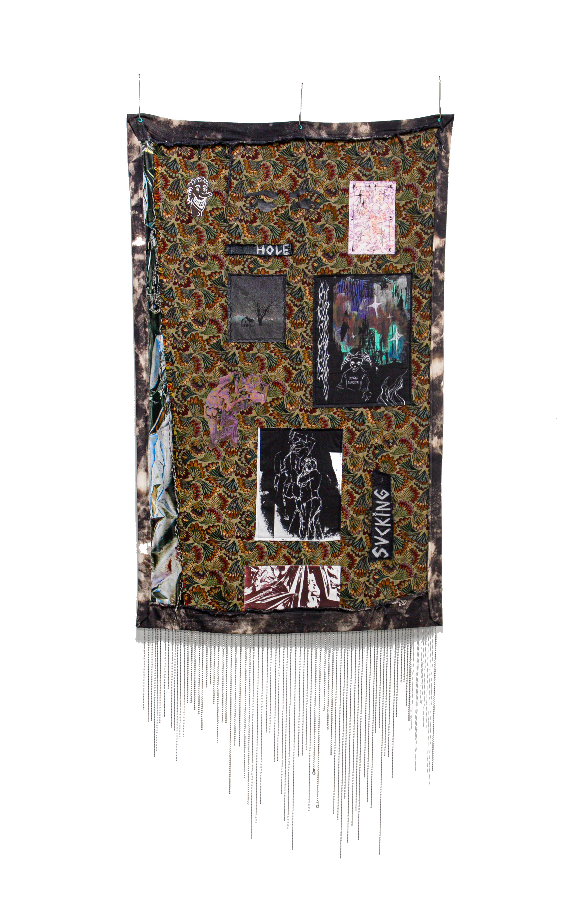 hole, sucking, 2025, hand bleached cotton, found fabric, inkjet print on paper, satin, and canvas, acrylic, 56.5 x 34.5 inches