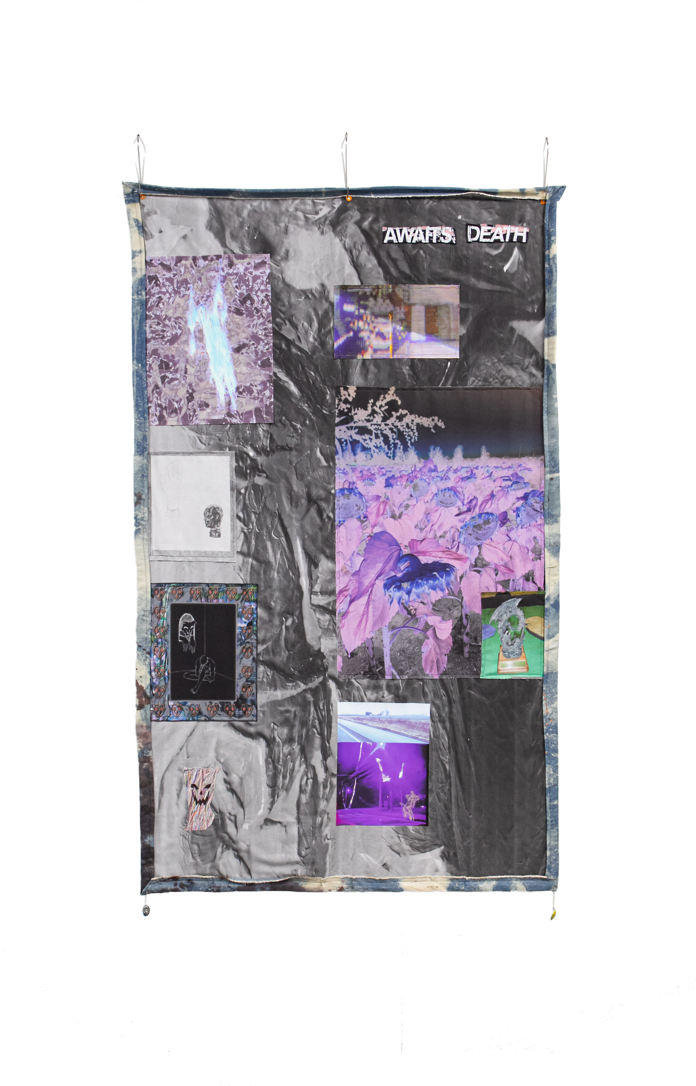 awaits death, 2025, inkjet print on cotton and paper, hand bleached denim, mixed media, 58 x 36 inches