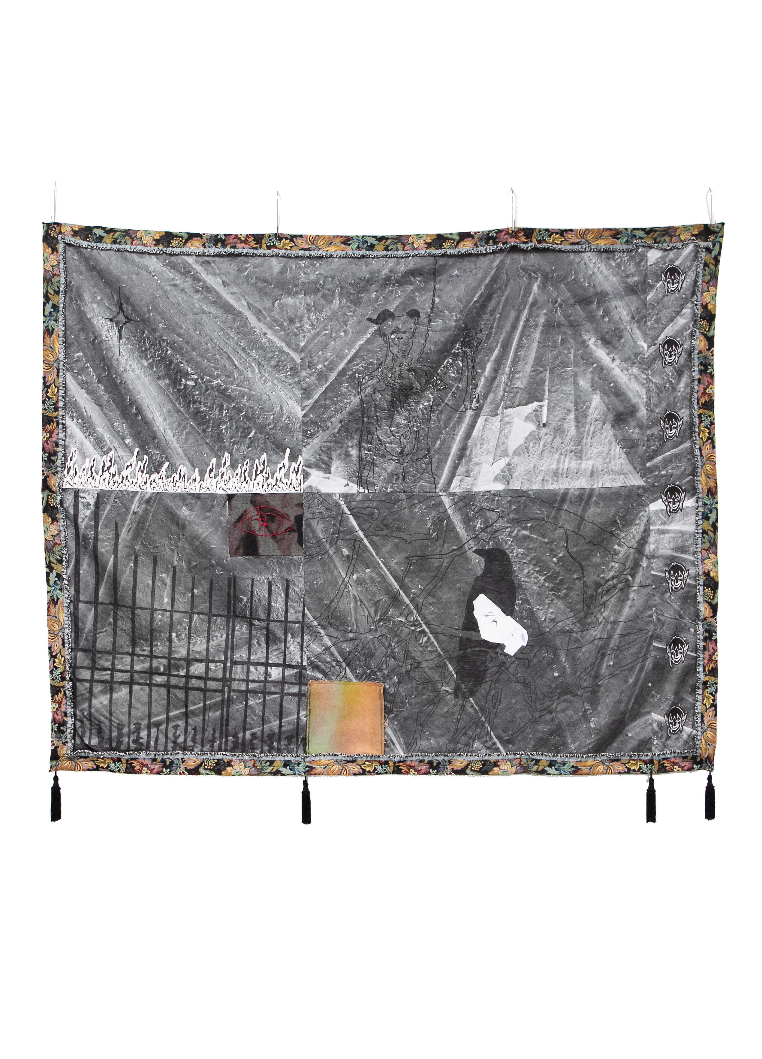 fire walk w/ me, 2025, inkjet print on cotton, canvas, and paper, hand dyed fabric, charcoal, 58 x 71 inches
