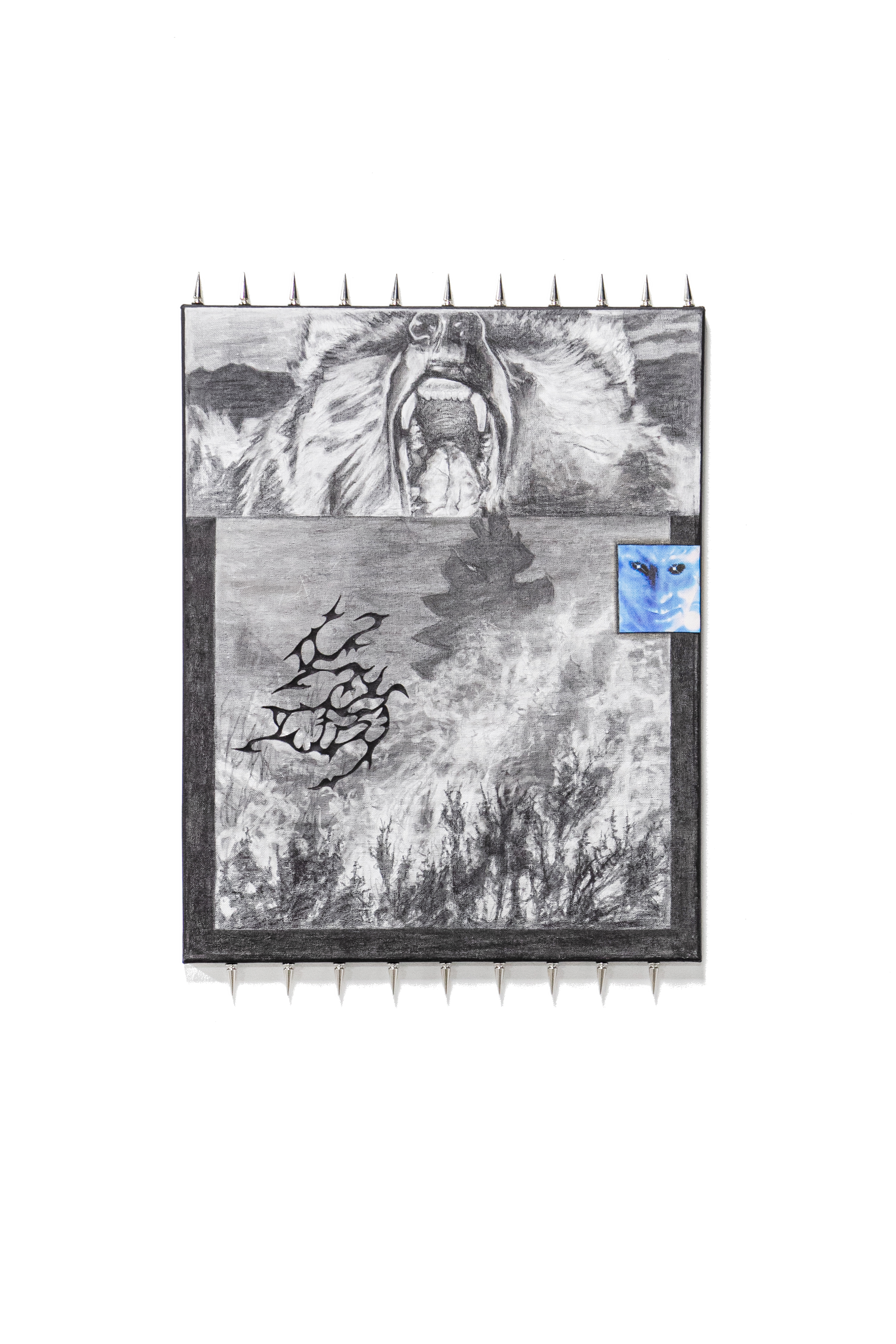 grizzly, 2025, graphite, charcoal, acrylic, and inkjet print on canvas, 20 x 15 3/4 inches