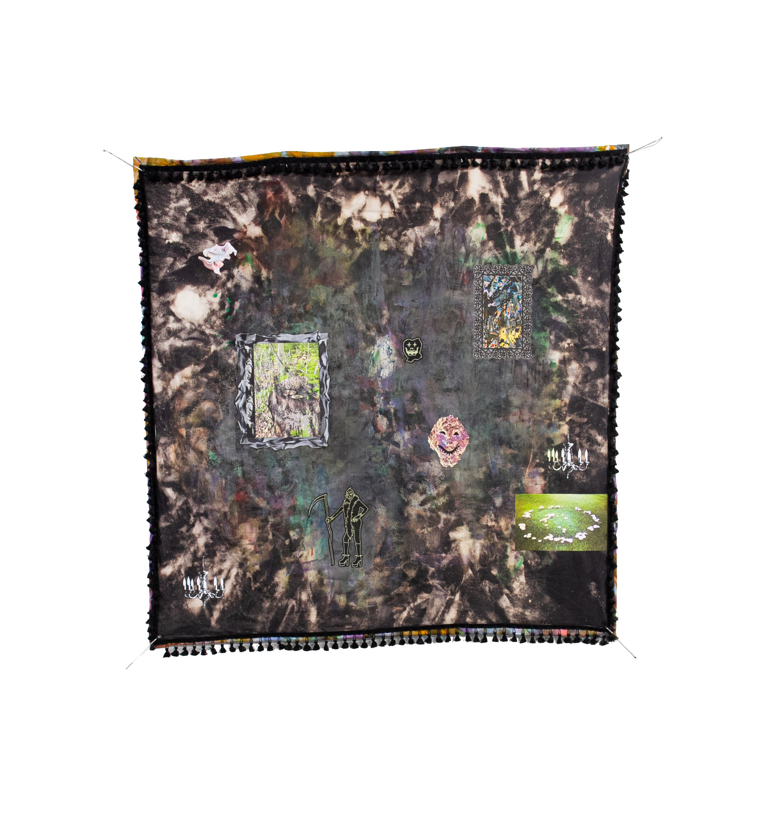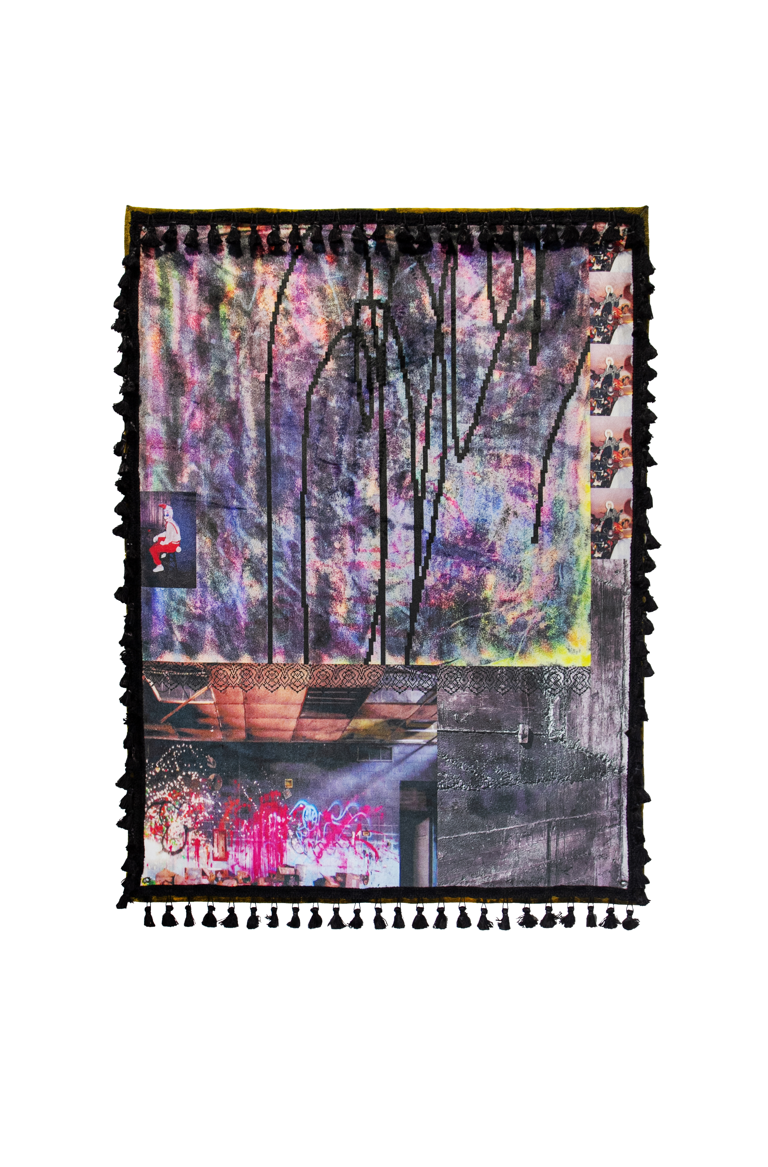 stitious, 2025, inkjet print on velvet, hand bleached velvet, tassels, 35 x 26 inches