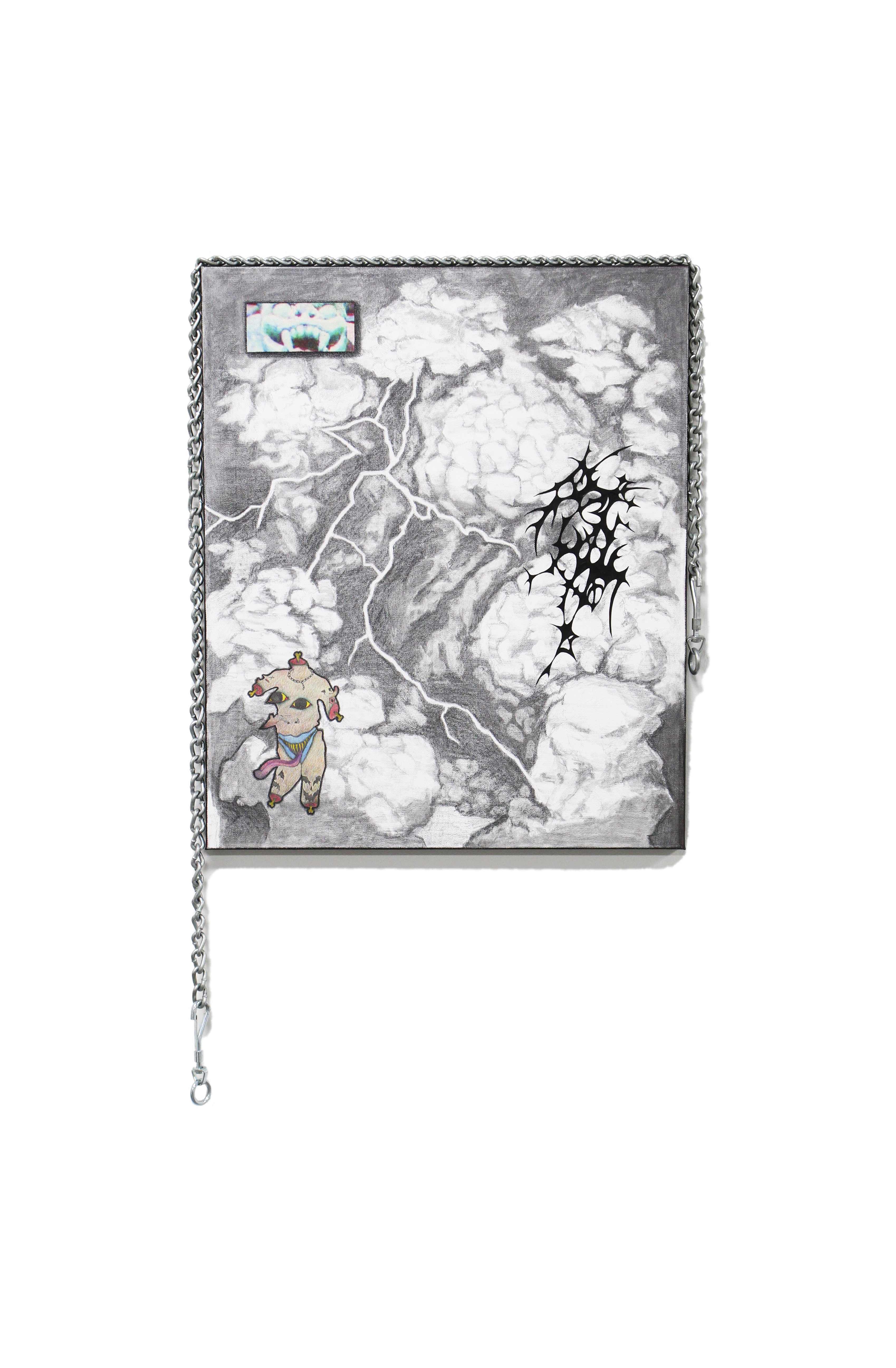 fixation, 2024, inkjet print on satin and canvas, mixed media, 58 x 35 inches